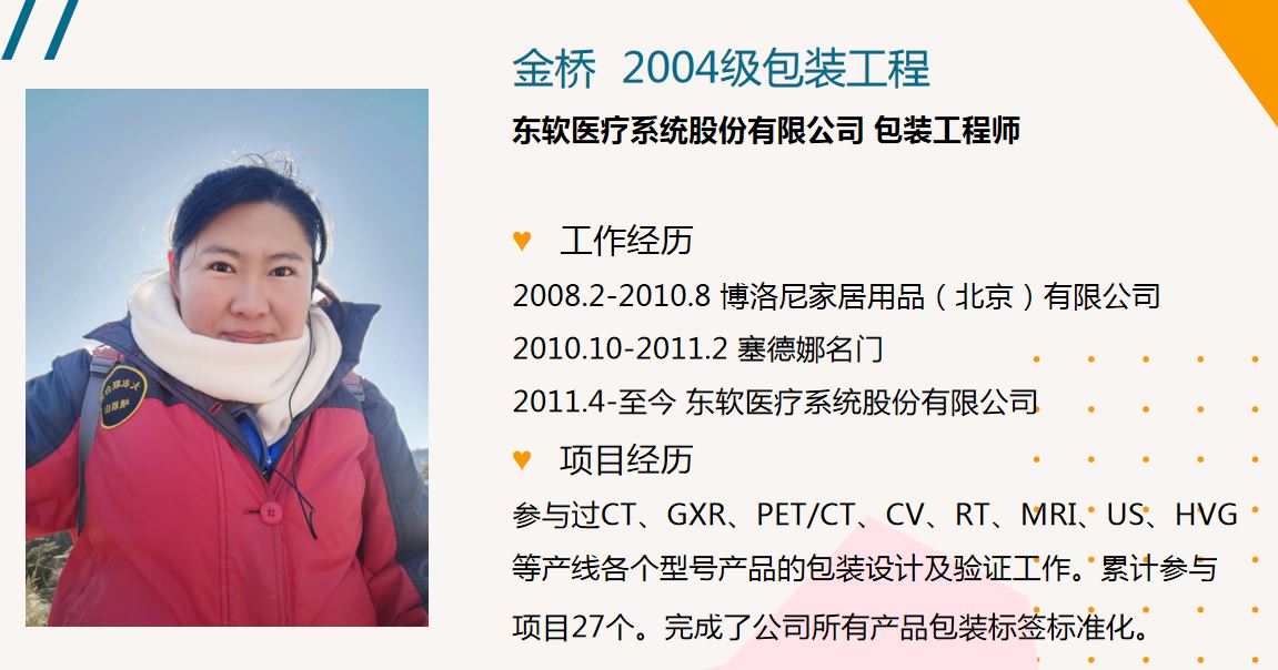 金桥是2004级包装工程毕业生,她用亲身经历介绍了自己的成长历程:从家具产品包装技术员到工艺工程师,从工艺工程师再到包装项目负责人,现在负责包装项目的全流程管理。她告诉学弟学妹们:由于包装行业涵盖了市场、销售、研发、可靠性、测试、工艺、生产和服务等多方面工作,大学期间所有基础课和专业课都要认真学习。掌握扎实的专业知识非常重要,这有助于你与行业中的技术人员进行高效交流,更快进入角色,才能在包装领域中取得好的工作业绩。