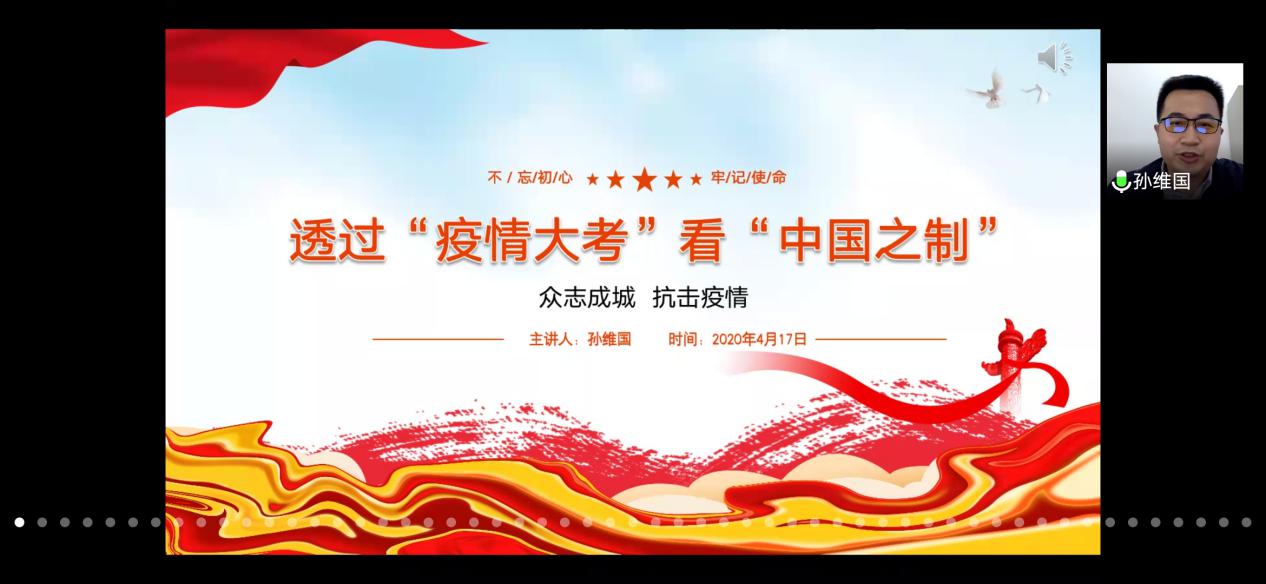 党委书记李洪峰、党委副书记孙维国分别以“梦想、创新、实干——新时代中国土木人的传承和坚守”、“通过‘疫情大考’看‘中国之制’”为题讲党课,列举了抗疫战“疫”过程中的先进人物和典型案例,全面阐述了抗击疫情斗争所体现出来的国家强大力量、社会主义的制度优势、人民团结奉献的时代精神,带领广大学生进一步读懂大国担当和家国情怀,进一步理解了历史责任与时代担当,激发了广大青年学生的爱国热情与民族自豪感,引导青年学生牢固树立“四个意识”,坚定“四个自信”,坚决做到“两个维护”。