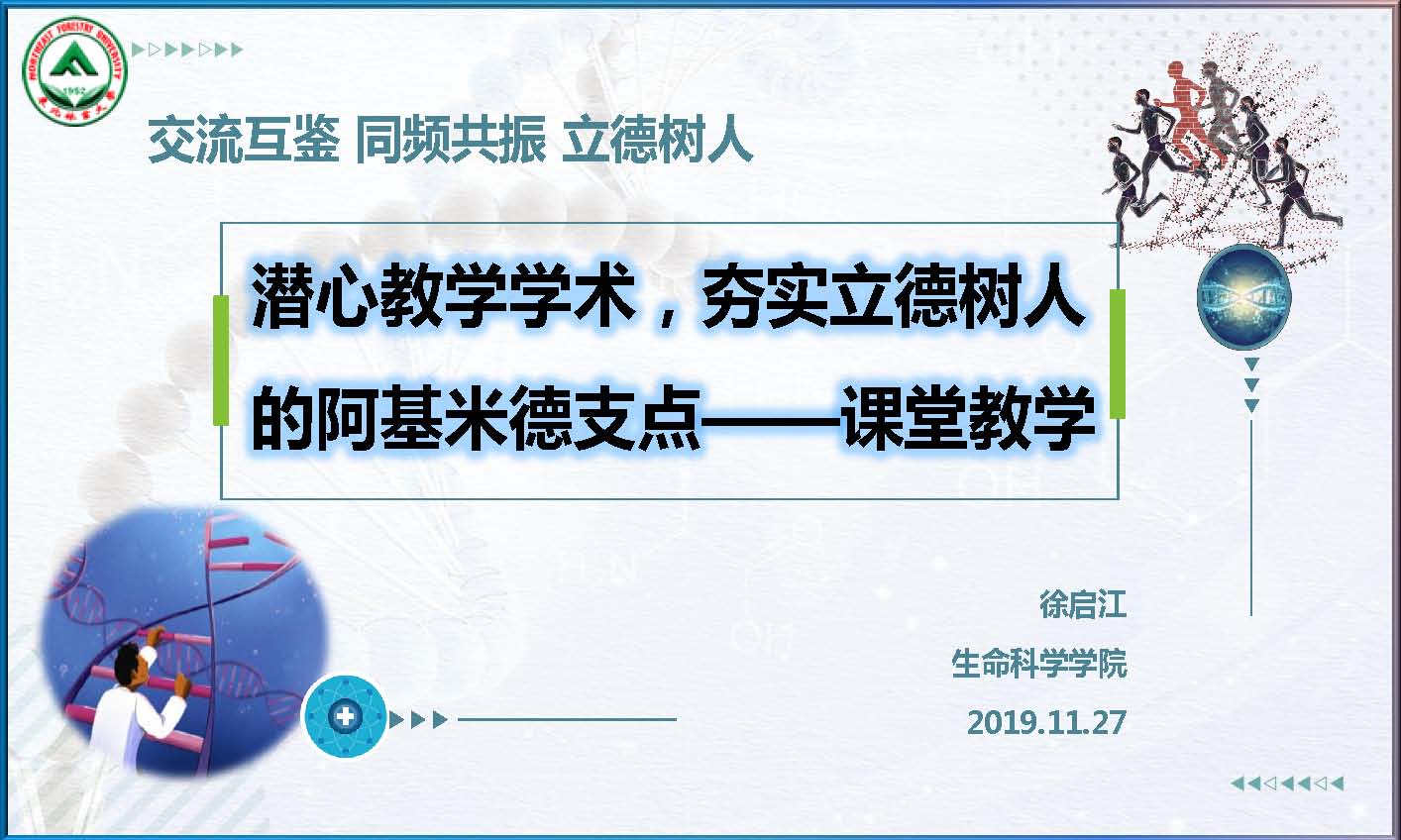 11月27日,生命科学学院结合深入开展“不忘初心,牢记使命”主题教育活动,以学院两位教授荣获全国高校生命科学类微课教学比赛一等奖和二等奖为契机,邀请徐启江老师为全院教师作了题为“潜心教学学术,夯实立德树人的阿基米德支点---课堂教学”的本科一流课程建设经验交流会。徐老师引古论今、传承经典,精彩纷呈,从世界正处于百年未有之大变局背景下高等教育的创新与变革、从教师的历史使命、时代担当到一流本科教育的中国方案;围绕着“两金一高”、课程思政、建立以“学生发展为中心”的师生学习共同体促进学生进行深层次成就式学习的学术生态课堂,做了详细解读和介绍。特别是对在教学中如何结合课程内容润物细无声地做好立德树人工作,即如何在课程中体现课程思政元素等方面做了深入透彻的阐述与示范。老师们纷纷表示意犹未尽。“如沐春风,如淋甘露”,隋广超教授听后如是说。