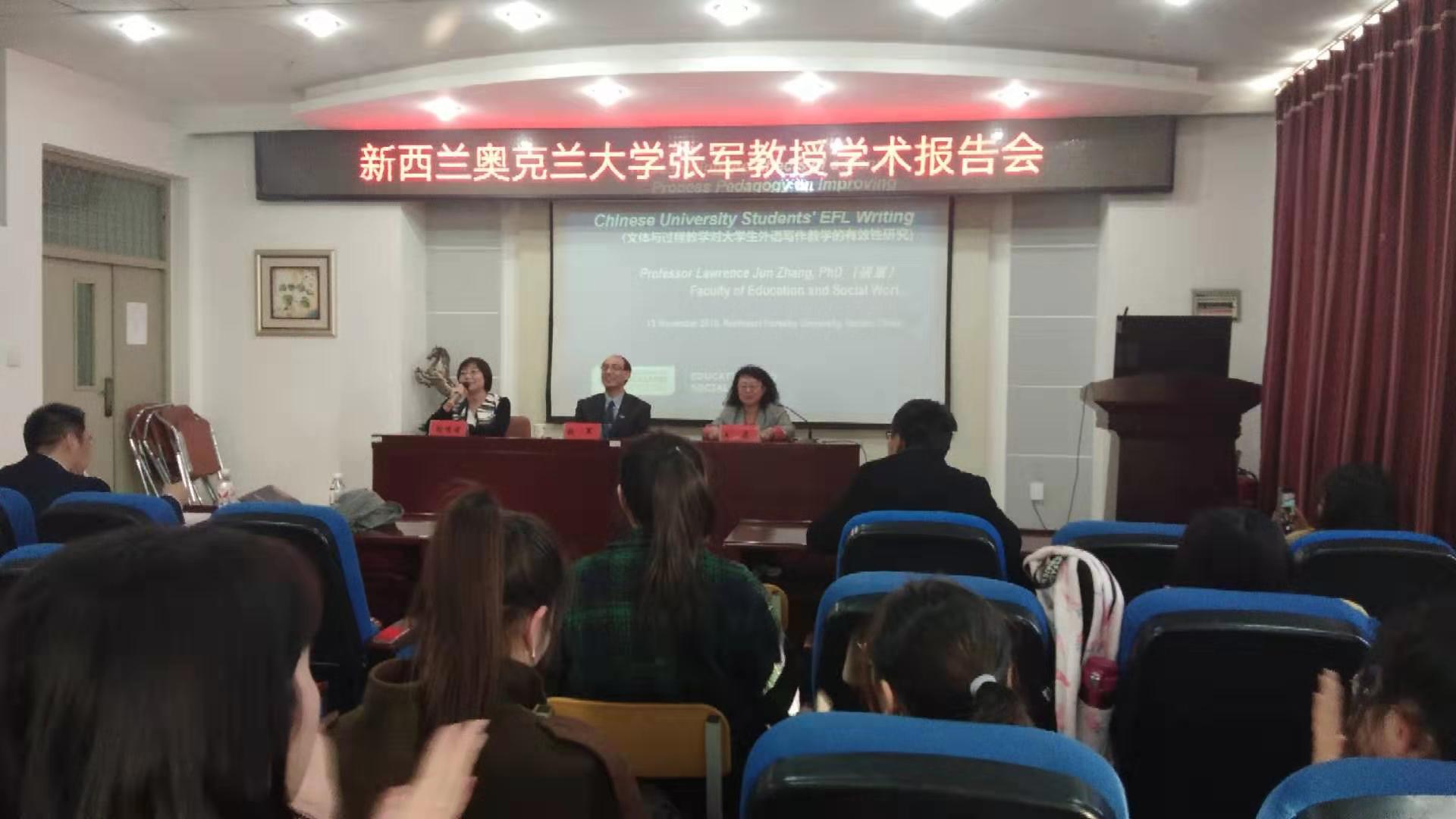 应我校外国语学院邀请,国际著名二语习得和外语教育专家,新西兰奥克兰大学教育学部副部长、博士生导师张军教授(Professor Lawrence Jun Zhang)于11月13日莅临指导,主讲了题为“文体与过程教育教学理念对外语写作教学的有效性研究”的学术报告。外国语学院党委书记、外语语言文学学科带头人王丹教授对张军教授的来访表示欢迎,学院分管科研的张鸣瑾副院长主持会议,学院教师及硕士研究生百余人前来聆听,外国语学院报告厅座无虚席。