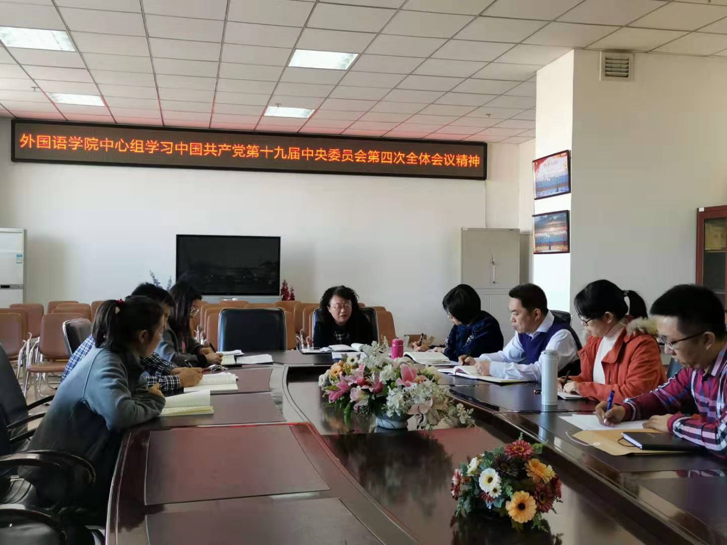 11月7日9时,外国语学院党委在文博楼1210室召开党的十九届四中全会精神集中学习会,学院党委理论学习中心组全体成员参加了本次集中学习。