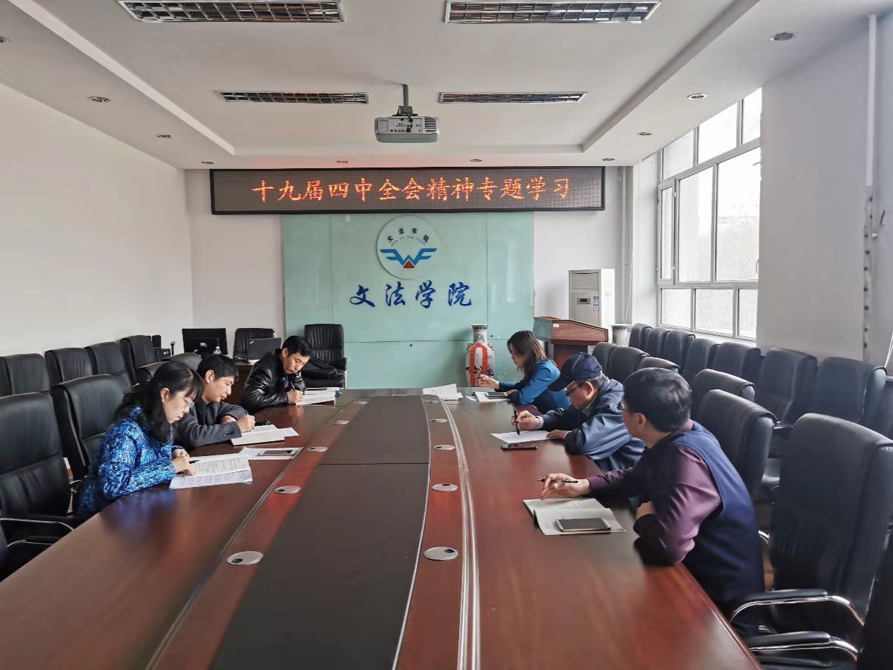 2019年11月6日上午,文法学院党委中心组按照学校政治理论学习安排和相关要求,在学院会议室召开了深入学习和贯彻党的十九届四中全会精神专题学习会,学习会由学院党委书记李玉荣主持,学校第一巡察组副组长赵立杰到会指导。