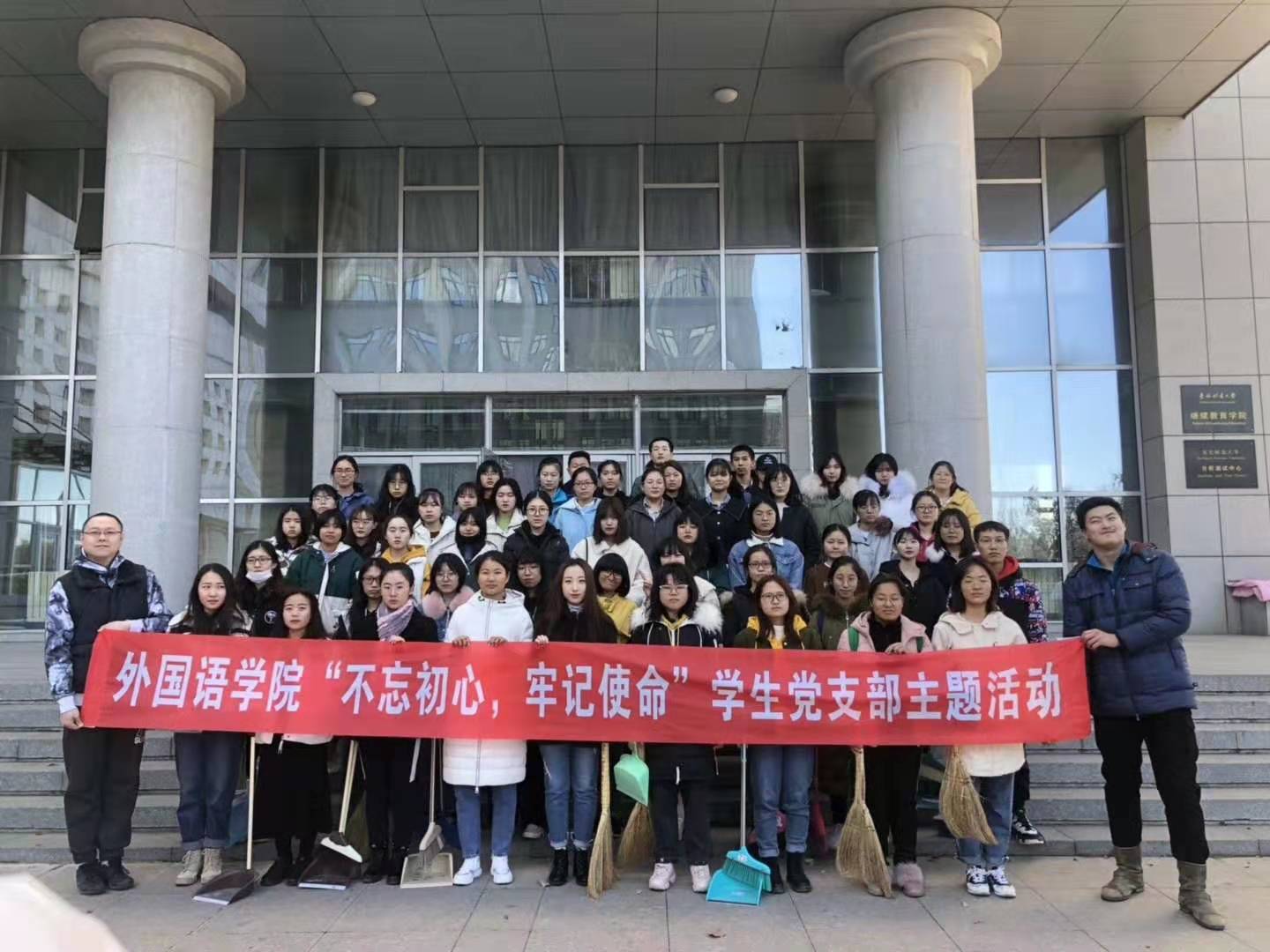 不忘爱党爱国初心、牢记生态文明使命。为了更好的将理论与实践相结合,2019年11月3日,外国语学院党委组织学院第十九期积极分子暨发展对象培训班全体学员,开展了“不忘初心、牢记使命”学生党支部主题党日活动,百余名培训班学员分成四组,分别在我校家属区、林场、冰场及南校区学生公寓楼附近开展了清扫街路、清捡垃圾等活动。