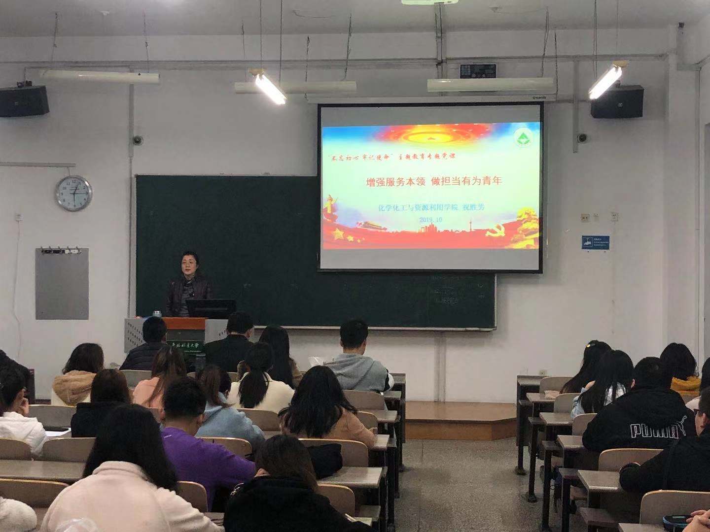 10月22日晚,学院党委副书记、副院长祝胜男为全体学生党员、学生干部代表讲授《增强服务本领 做担当有为青年》专题党课。