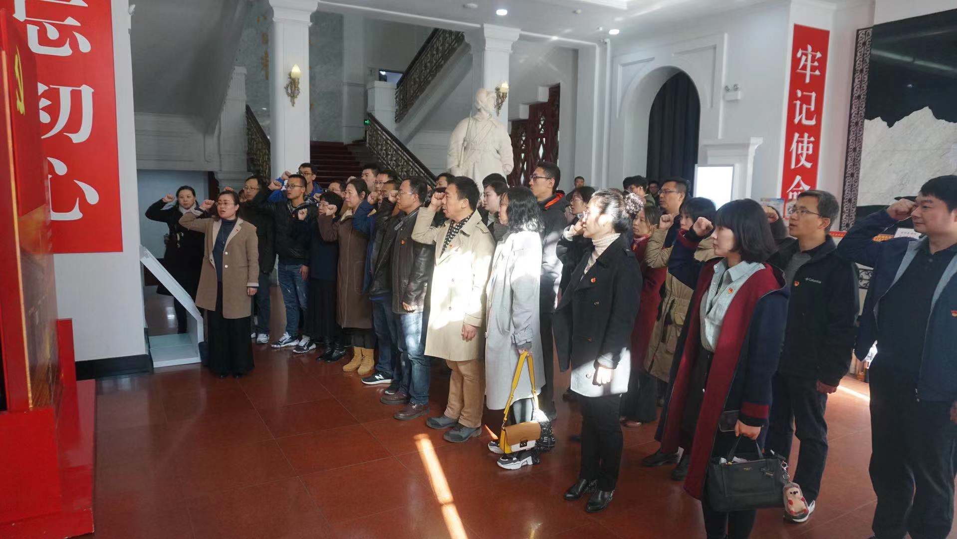 在纪念馆前厅,学院党委书记陈春霞带领全体教工党员重温了入党誓词,将本次主题党日活动推向了高潮。