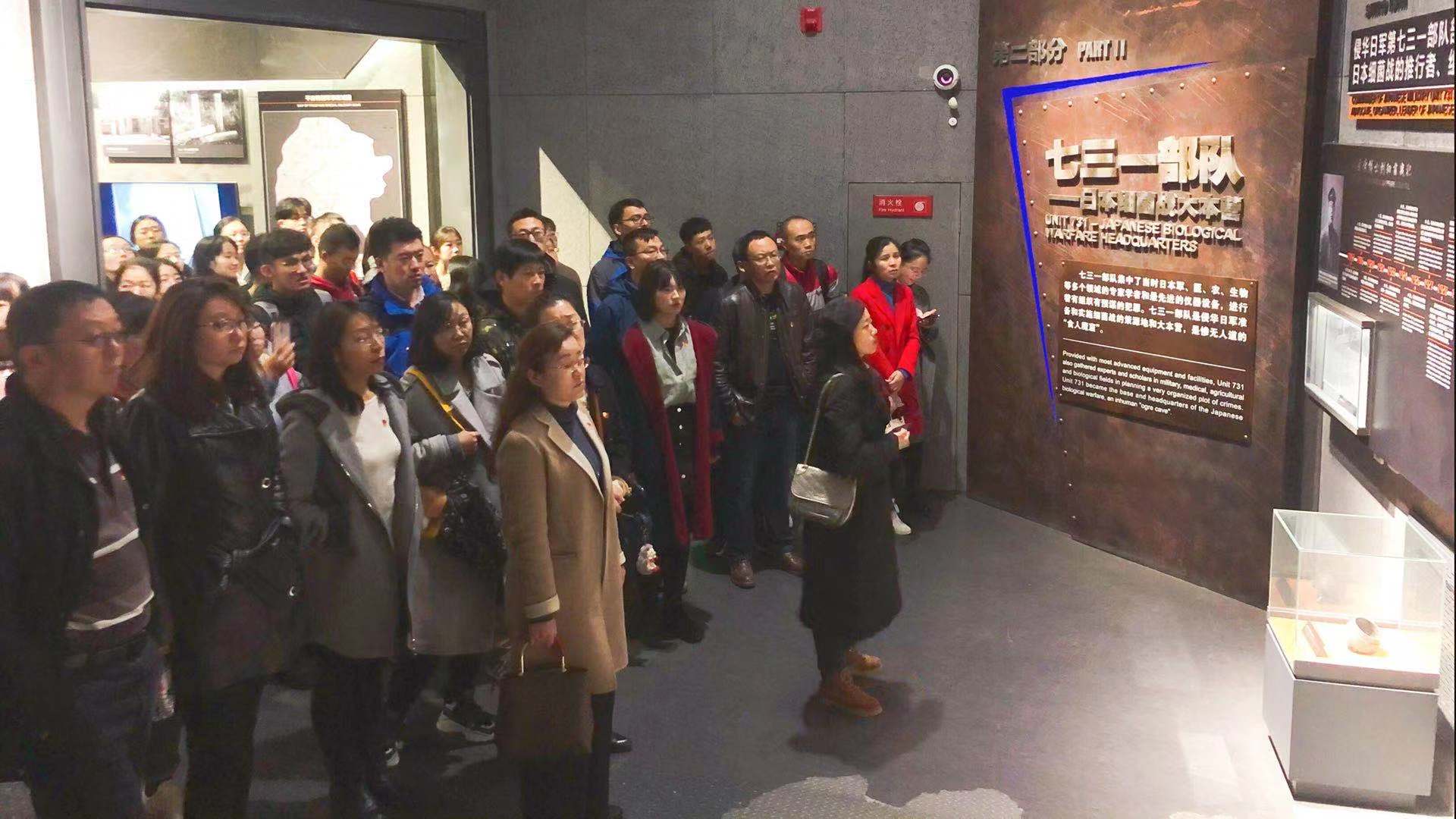 在侵华日军第七三一部队罪证陈列馆,大家在讲解员的带领下驻足观看,陈列馆以大量的文物、文献、照片、视频展示等控诉了侵华日军七三一部队的细菌战和人体实验罪行,将侵华日军犯下的反人类暴行昭告天下,警醒人们以史为鉴、珍爱和平。不能忘却的历史、触目惊心的罪证,让在场的每一名党员都沉浸在悲痛之中。