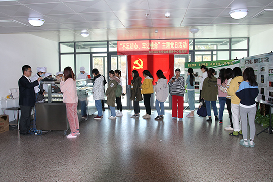 根据“不忘初心,牢记使命”主题教育方案的要求,10月21日上午,后勤保障部饮食服务中心党支部全体党员和积极分子,在颐丰园餐厅和学生公寓16号楼开展“不忘初心、牢记使命,立足本岗、服务师生”的主题党日活动。