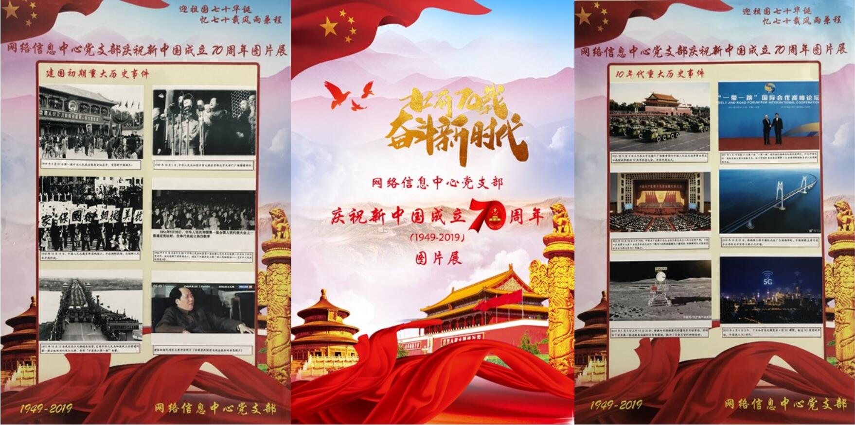 在新中国70华诞到来之际,网络信息中心党支部结合“不忘初心、牢记使命”主题教育活动,在图书馆B区6楼举办了“迎祖国七十华诞,忆七十载风雨兼程”国庆图片展活动,网络信息中心全体员工共同参与了本次活动。