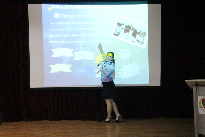 会上,哈尔滨出入境管理局金云龙、韩梅警官就违反《中华人民共和国出境入境管理法》有关规定的外国人在华非法就业、非法居留、非法宗教活动等具体案例及处罚措施等进行了全面讲解。他要求留学生要珍惜在华学习机会,严格遵守中国法律、法规,不要参与任何有悖于留学生身份的非法活动。现场留学生积极提问,金云龙警官耐心细致地一一解答。