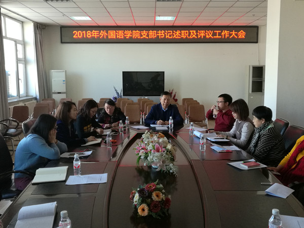 2019年1月2日上午,外国语学院在文博楼会议室召开2018年度学院党支部书记述职及评议工作大会,学院领导班子成员以及各支部的支部书记参加了本次会议。