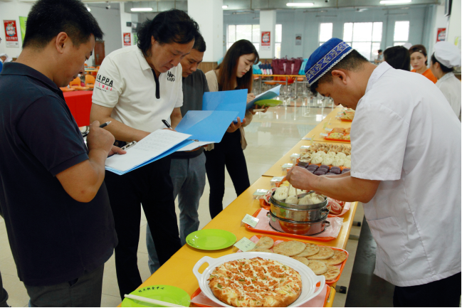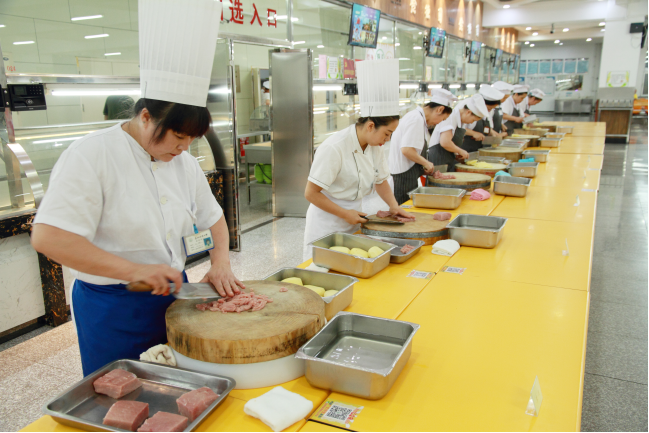 首先,饮食服务中心主任苗国民宣读了比赛内容和规则。此次比赛由刀工、白案、红案和服务技能四项组成。刀工比赛要求选手在规定时间内切制同等数量的肉丝和土豆丝,按照成品的粗细均匀、成品率打分;白案比赛要求选手制作园笼包和馅饼2种规定主食和3种创新主食,按照成品的形状、感观、口味打分;红案比赛要求选手烹制青椒炒肉丝和烧茄段2种规定副食和3款创新菜品,按照成品的色、香、味、形打分;服务技能比赛按照选手打卡、打饭的速度快慢和准确率打分。所有参赛选手均为饮食服务中心一线班组的炊事员。此外,饺子园的花样水饺,面包房的黑眼豆豆面包、提子酥点心、抹茶曲奇和树莓慕斯蛋糕,教工餐厅大厨烹制的黑椒牛肉粒、鲍片、柠檬山药和兰度百合炒木耳四道拿手好菜参与展示,大大丰富了主副食品的花色品种,为此次比赛增添了亮点。