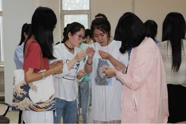 活动伊始手工文化研创工作室负责人孙巧歌同学对五彩绳的编制方法及文化内涵进行了简要介绍,“五色分别代表了五行和五个方位,青色属木,代表东方,赤色属火,代表南方,黄色属土,代表中央,白色属金,代表西方,黑色属水,代表北方,古人以此祈求辟邪去灾,祛病延年。”志愿者们实际动手操作,大家一边分享自己家乡关于中国传统节日端午节的一些习俗,一边用心编制着五彩绳。