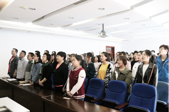 观看“纪念马克思诞辰200周年大会”电视直播伊始,全体起立,高唱国歌