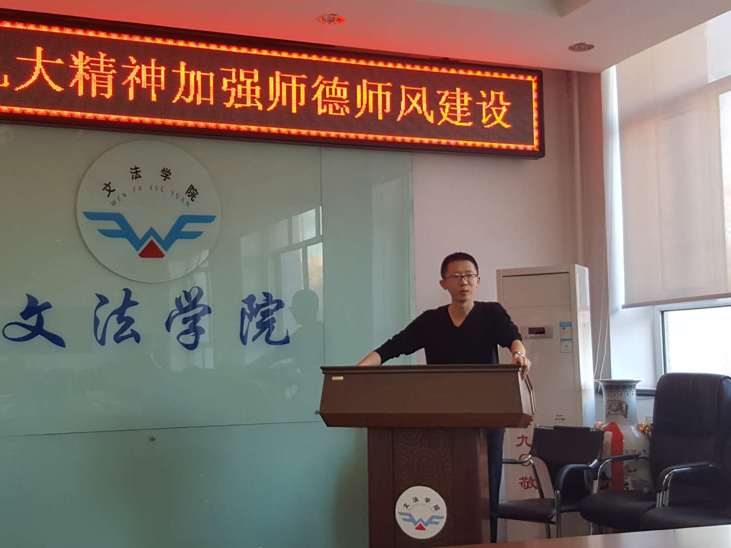 文法学院党委书记高春光指出,在学习贯彻落实十九大精神的工作中,要在加强十九大报告、党章等的基础性学习的同时,突出学院特色活动。他鼓励中青年教师要努力工作,在学院的业务和思想建设上发挥越来越大的作用。