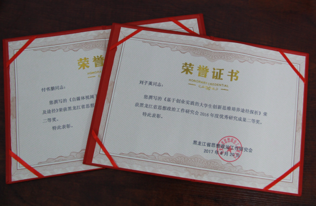学工部在接到《关于开展黑龙江省思想政治工作研究会2016年度优秀研究成果评选工作的通知》后,积极宣传,认真组织辅导员老师撰写论文进行申报,通过组织学校专家对提交的所有论文进行初评后,按通知要求推荐3篇论文和研究报告报送到省委高校工委宣传部参加全省高校系统联评,经过专家审核筛选后推荐到黑龙江省思想政治工作研究会进行最终评审。最终,刘子英撰写的《基于创业实践的大学生创新思维培养途径探析》和付书朋撰写的《自媒体视阈下“95后”大学生思想政治教育的任务及途径》获得二等奖,展示了我校辅导员在日常思想政治教育实践基础上形成的优秀理论研究成果。