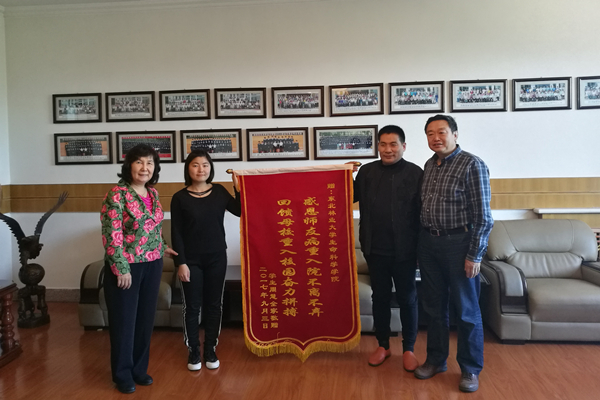 张明书记及李玉花院长代表全院师生收下了周慧及父亲送来的锦旗,并表示:在我们的学生遇到困难的时候,学院一定是学生坚强的后盾;学生能够恢复健康、重返校园就是对学院工作最大的肯定与鼓励。同时,希望周慧返校之后,能够注意身体,加强锻炼,跟紧实验进度,顺利完成学业,为将来奉献社会、奉献国家做好充足的准备。(张国权)