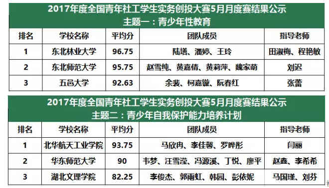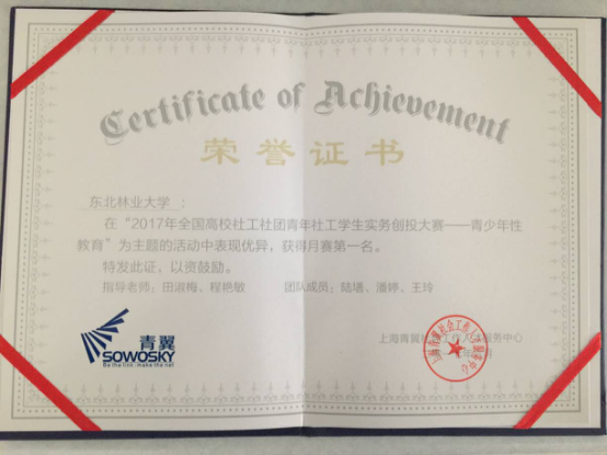 近日,2017年度全国高校社工社团青年社工学生实务创投大赛竞赛结果揭晓,我校文法学院社会工作专业陆墡、潘婷、王玲三名同学在田淑梅、程艳敏老师的指导下一举夺得五月份月度全国冠军。他们即将代表东北林业大学在暑假期间去往广东进行项目落地实施,并且参评年度总冠军。
