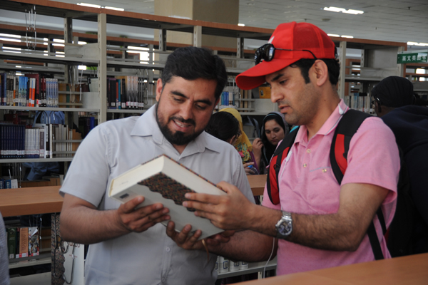 在六楼外文图书流通区,工作人员向留学生们介绍了我馆的馆藏资源、外文书籍的布局、借阅办理流程等。在二楼自动检索机处,工作人员耐心地指导留学生们利用检索机查询书籍。留学生每到一处,工作人员都为他们进行了细致的讲解,并对他们提出的各种问题给予解答。针对留学生们提出的图书馆馆藏之外书籍的需求问题,王立海馆长明确答复:留学生向图书馆相关工作人员提供所需书籍名称即可,图书馆会对所需书籍进行统一采购。