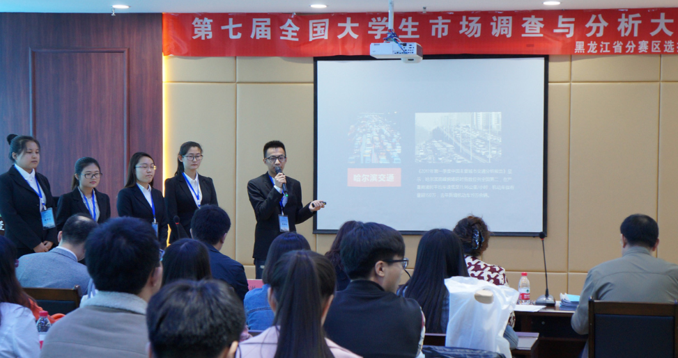 上午9时比赛开始,来自哈尔滨工业大学、黑龙江大学、哈尔滨金融学院、黑河学院、大庆师范学院以及东北林业大学6所高校的25支参赛队伍分A、B两组,按照抽签顺序依次上台展示调研成果并答辩。每位参赛同学都在台上表现自如,各展风采。同学们市场调查的主题也同样各具特色,实用新颖。评委老师认真点评同学们的调研思路与调研成果,鞭辟入里地分析了每个参赛项目的长处与不足,也给予了同学们许多宝贵的修改建议。