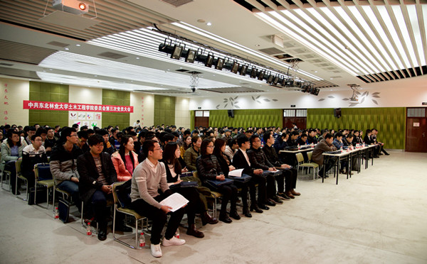 下午2时整,大会在庄严的国歌声中开幕。土木工程学院副院长王立峰同志致开幕词,代表土木工程学院领导班子对大会的召开表示热烈的祝贺。土木工程学院党委书记石振武同志代表学院第二届党委做题为《站在新起点、谋划新发展,实现新跨越、开创新局面》的工作报告。报告分三个部分,一是从贯彻从严治党新要求,全面加强和改进学院党的建设;发挥党委核心作用,促进学院各项工作健康稳步发展两方面对上一届党委的主要工作进行回顾和总结。二是客观地剖析了上届党委工作存在的主要问题。三是提出了党委今后奋斗的目标与发展方向,并号召全体党员一起为早日把学院建设成为国内一流的土木工程学院而努力奋斗。接着,土木工程学院党委委员田玉梅同志做《中共东北林业大学土木工程学院第二届委员会关于党费收缴、上交和使用情况的报告》。然后,全体与会党员审议并通过了两个报告。