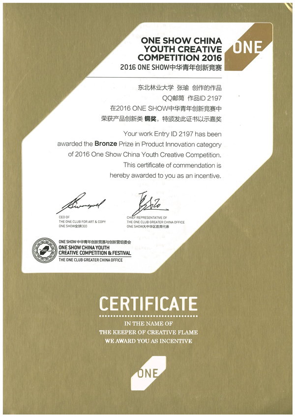 近日,全球顶级广告专业赛事ONESHOW(又名“金铅笔”奖)中华青年创意节在上海举办,2016年中华青年创意节参赛作品共6000件,参赛人数约3万人。我校文法学院广告学专业张瑜团队获得QQ命题产品技术类铜奖。