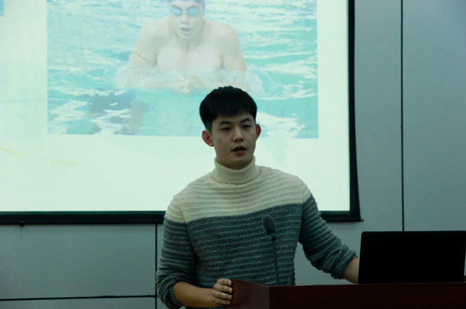 筑梦环节,三位同学依次介绍了与游泳结缘的点滴故事。陈思远以时间为主线讲述了自己在游泳队中的成长历程。她说,“初入队伍时,面对实力强劲的队员,因为害怕成为累赘就下定决心,要努力成为最优秀的自己”。接着,她现场回忆了参加全国赛的情形,当时在比赛的同时还和每个大学生一样,都面对来自学业、学团活动的种种压力,但她一直坚持着。在她的讲述里,清晨六点的早操,午夜伴读的月光,三千多米的加训,这些曾经的艰辛最终都化作了最美好的回忆,静静留在心中。接下来,王玉涛分享了他的训练经历与感想,在他的故事里,提到最多的是队员们的刻苦与团结、教练的和蔼与关怀,他说:“与他们在一起的时光是最快乐的”。王玉涛将游泳馆比作第二个家,泳池中的奋起直追,观众席中的声声呐喊助威,都让自己深深地爱上了为之奋斗的战场,爱上了每一朵绽放的水花。王玉涛说:“游泳带来的虽有伤痛,但更多的是荣誉、友谊”。随后,侯淞译分享了大学期间的游泳经历。他围绕比赛这一主题,讲述了校游泳队的成长历程,从折戟杭州到圆梦鄂尔多斯,每次的跌倒与爬起,让他们成为了凝聚力最强的团队。在对“游泳队大家庭”的介绍中,队友相互间的激励与鞭策令人印象深刻。话语之间,流露着侯淞译同学对游泳队的热爱、珍惜和责任。