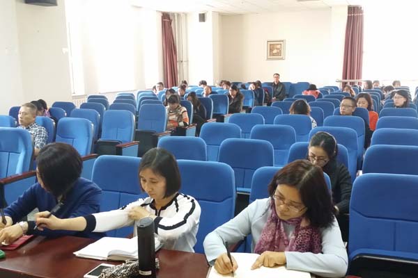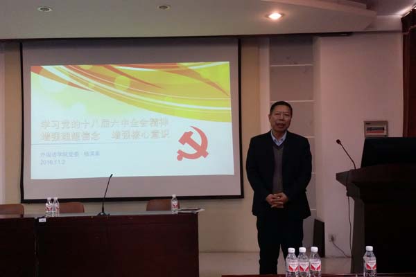 2016年11月2日下午,外国语学院党委在文博楼多功能厅举办了“两学一做”系列专题学习活动,外国语学院党委书记杨滨章结合自己对十八届六中全会公报的学习做了“学习党的十八届六中全会精神增强理想信念 增强核心意识”的专题报告,学院领导班子成员和全体教工党员参加了本次学习。