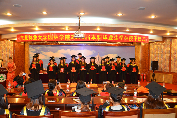 学位授予仪式在雄壮的国歌声中正式拉开帷幕。园林学院党委书记王竞红和副院长周蕴薇,分别宣读了获得2016届东北林业大学优秀毕业生称号和第二届“绿翼杯”野生花卉应用设计征文大赛获奖的学生名单,并由学院领导和教师为获奖学生颁奖。紧接着,学院院长许大为代表学院与毕业生代表互换纪念礼物,并亲自为每一名完成学业的园林学子授予学位,拨转流苏,将整个学位授予仪式推向了高潮。