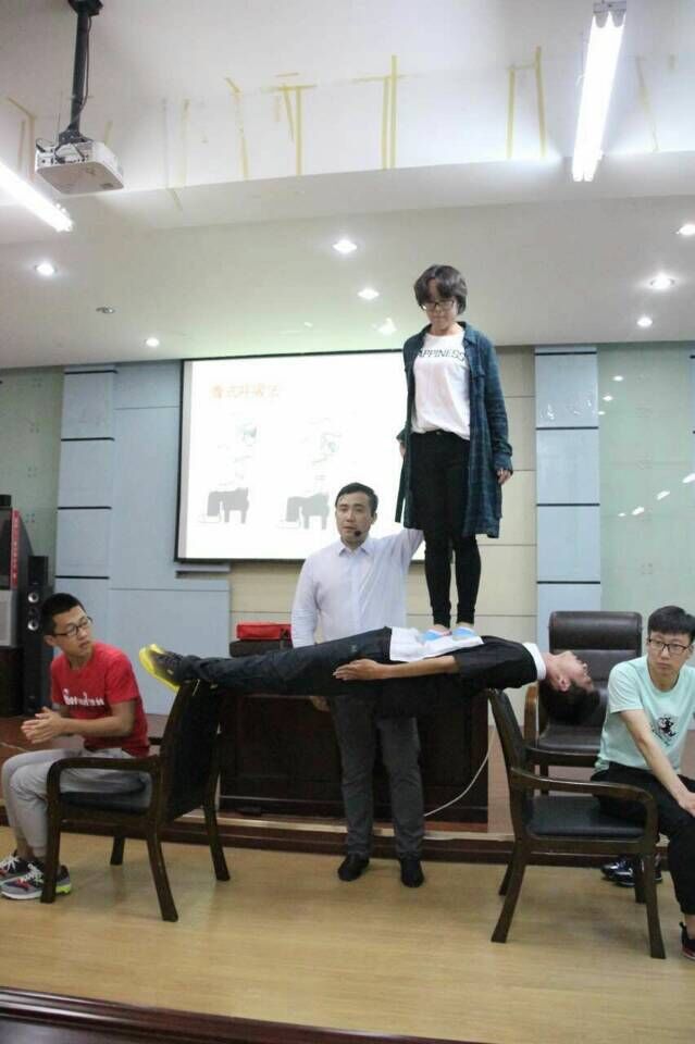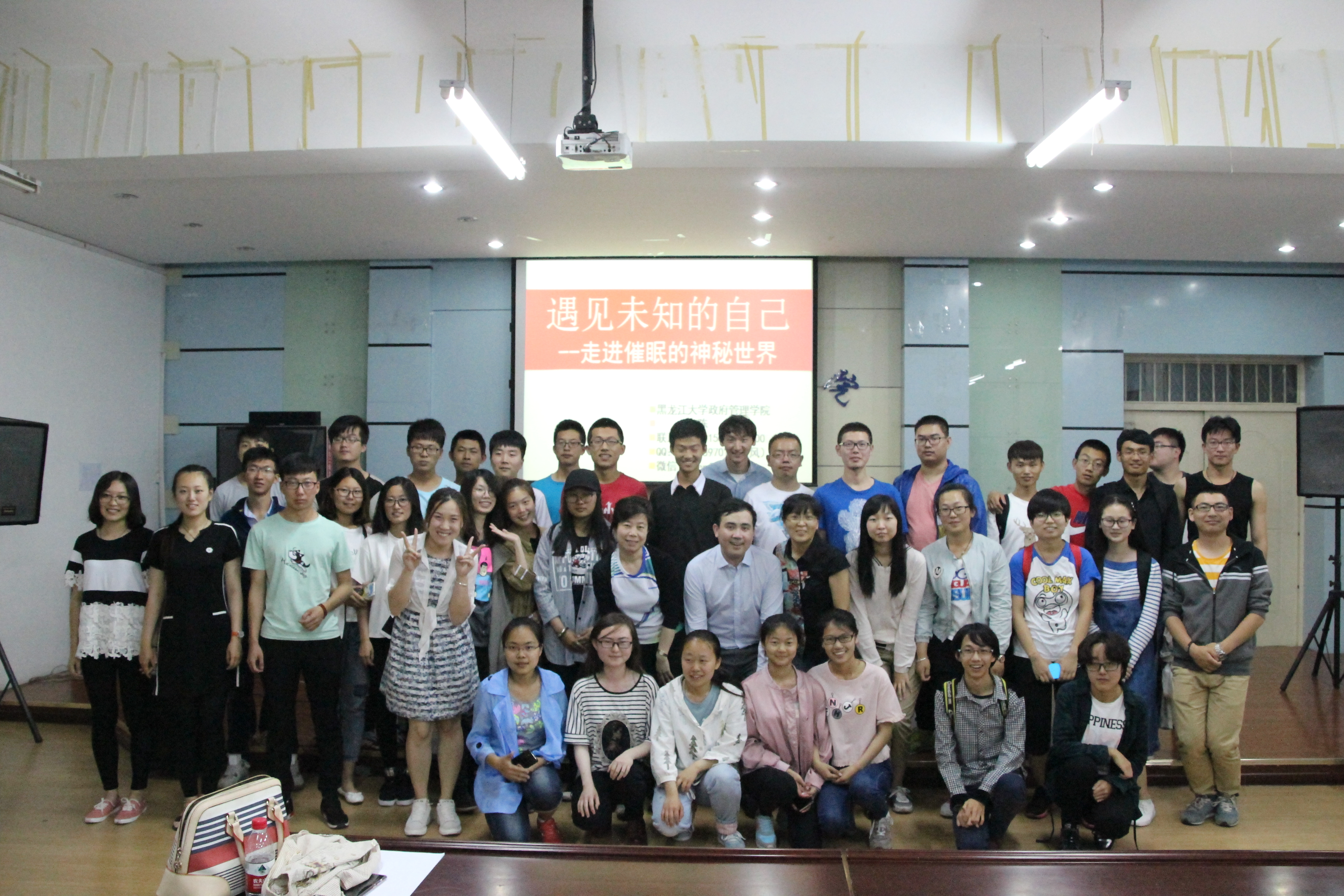 2016年6月13日晚6点在土木工程学院501会议室,受邀的黑龙江大学陈锋老师带领大家一起探索了“催眠”的神秘世界。活动伊始,陈老师对同学们关于催眠的兴趣程度进行了简单的调查了解,接着又举了几个生活中催眠的例子。之后,老师对“催眠”这个神秘的名词进行了简单概述,从“催眠术”、“正确的催眠观念”、“催眠历史”、“催眠的应用”、“催眠要素”这几个方面进行讲解,还着重地讲解了“腹式呼吸法”和“放松法”这两个催眠放松技术。讲座中轻松愉悦的氛围,引入入胜的分析,幽默风趣的介绍激起了现场同学积极体验的热情,随后,陈锋老师通过现场测试选取了两名自告奋勇且感受性强的现场同学进行了催眠。在陈老师的引导下,体验者的身体像一块钢板,一名女生站在只有头部和脚部有支撑点横躺的体验者身上,“坚实的人桥”稳固得令人惊呼。这些情景都体现了“催眠”的神秘,也让参与体验的同学看到了身体的潜能,带着开发出的潜能更好地在学习、更愉快的生活。