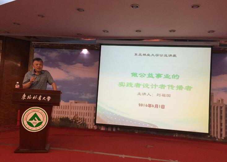 2016年6月1日黑龙江省妇女儿童基金会的刘福国高级政工师来到东北林业大学文法学院为师生做了一场主题为“做公益事业的实践者、设计者、传播者”的公益讲座。讲座人刘福国曾经参与执行的村规民约修订项目被全国妇联、国家民政部、农业部采纳并在全国推广;农村妇女参政议政项目在联合国妇女署推广。近年来关注特殊群体,在失独者、养老、妇女儿童等领域进行了公益、慈善探讨和实践;实践之余做公益领域项目设计、传播、推广,并发表若干公益领域文章。