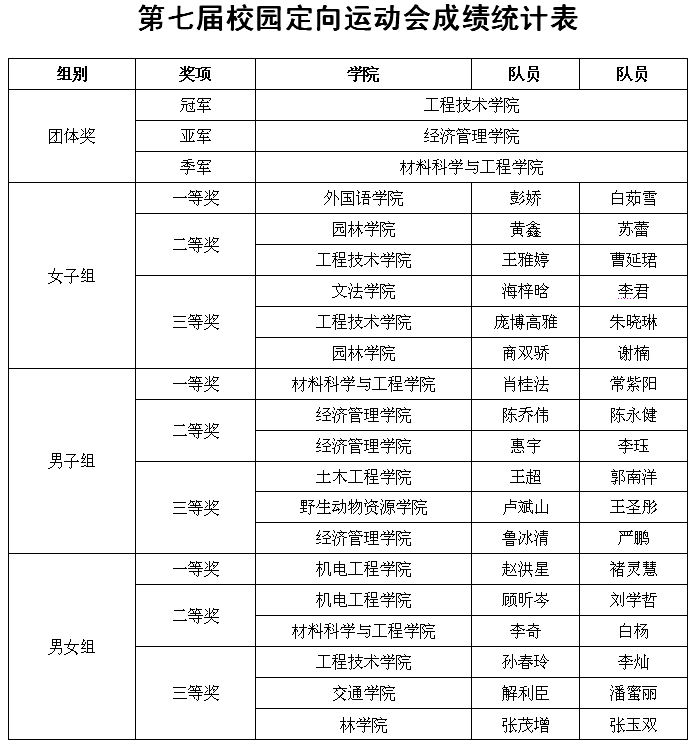 最终,团体成绩工程技术学院、经济管理学院、材料科学与工程学院分获冠亚季军,18组学生队伍分享了单项奖。伯仲之间见伊吕,指挥若定失萧曹,定向比赛不仅是速度地比拼,策略同样非常重要,材料科学与工程学院肖桂法、常紫阳两名研究生通过认真地准备和合理地选择线路以27分钟第一时间顺利完赛,并取得学生组最好成绩。