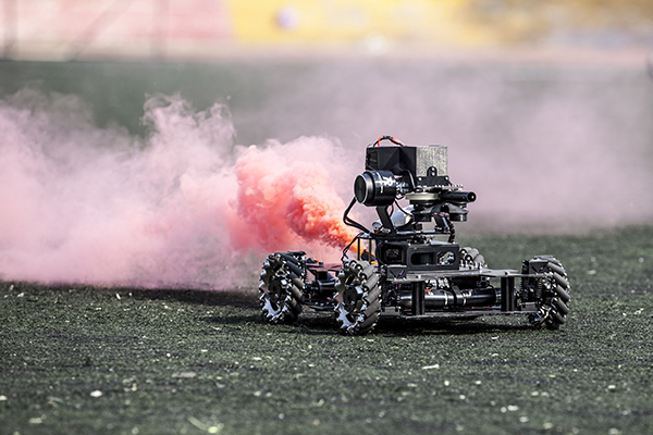 随后进入开幕式的表演环节。有炫酷的科技秀,东林-Ares机器人战队一左一右喷出红蓝色的烟雾,在田径场中央划出美丽的弧线,更有四轴飞行器进行运动会航拍,向大家展现出我院非凡的科技成果。更有热辣劲爆现代集体舞的表演,赢得现场同学们阵阵喝彩声。最后是刚柔并济的太极扇表演,两侧待命的表演太极扇的同学们身着白色太极服,手拿红色扇子进入场内,随着音乐的响起,表演者手中的扇子开开合合,在空中划出好看的弧度,精彩的表演将现场气氛推向了高潮。