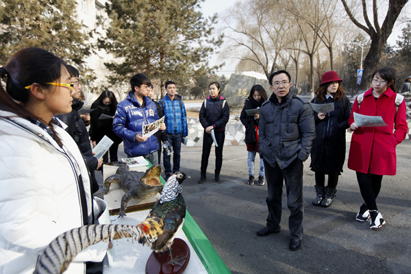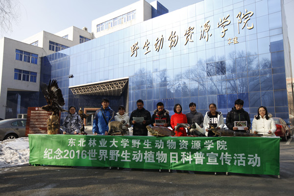 2013年12月20日,联合国大会第六十八届会议决定宣布每年的3月3日为世界野生动植物日。为了进一步宣传野生动植物保护科普知识,倡导身边的亲人、朋友共同参与野生动植物保护公益行动,在第三个“世界野生动植物日”即将到来之际,2月26日,野生动物资源学院部分师生在学院门前广场上,为来往群众、大学生开展了一场妙趣横生的野生动植物科普知识讲座。院长张伟、院党委副书记副院长玄凌、《野生动物》编辑部主任徐建民、专业教师代表刘薇以及院团委部分辅导员出席并向群众发放相关科普宣传品、讲解展出珍稀动物标本情况,纪念即将到来的世界野生动植物日,拉开了野生动植物科普系列活动的序幕。