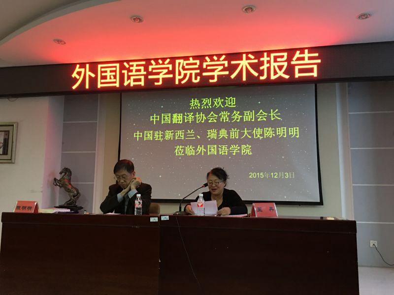 2015年12月3日15时30分整,中国翻译协会常务副会长、中国驻新西兰和驻瑞典前大使陈明明应邀来到外国语学院文博楼1019报告厅为学院师生做了一场题为“如何做好口笔译翻译”的讲座。陈明明副会长的到来受到了王丹院长和翻译硕士学科负责人赵莉教授的热烈欢迎,讲座由院长王丹教授主持。外国语学院教师、全体翻译硕士、科学硕士、部分英语专业本科生以及来自兄弟院校哈尔滨理工大学、黑龙江大学、东北农业大学的师生们也参加了此次讲座。讲座现场座无虚席。