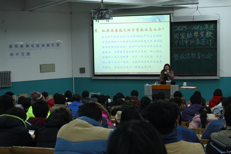 11月25日下午13时30分,学校在锦绣楼T102室举办了2015-2016年度国家助学贷款诚信教育及申请审批表签订活动。活动邀请了中国银行哈尔滨平房支行个人金融部于巧娜经理,同时162名新办国家助学贷款的学生参加了活动。