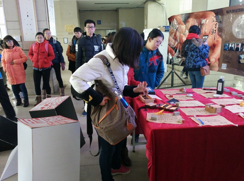 2015年11月9日至15日,中国(哈尔滨)森林博物馆“道印轩”志愿者团队篆刻作品展在丹青楼大厅举办,此次展览作品经过学员班精心挑选进行分组布置。为时一周的展览不仅吸引了广大东林学子踊跃前来参观,同时也受到了众多老师的关注。展览期间,志愿者们向参观者详细介绍了每个展品的由来以及篆刻手法,厚重的传统文化内涵引起了师生们很大的兴趣,并在交流中迸发出青年学子创新创业的火花与灵感。