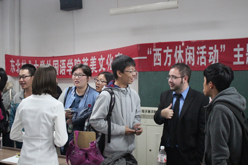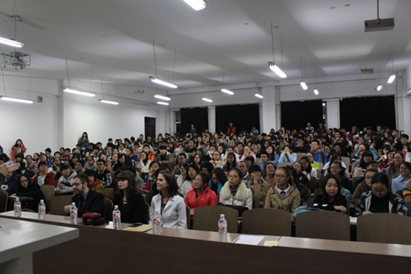 2015年10月14日晚18点,由外国语学院主办的“英美文化之夜”主题讲座在丹青楼425教室举办。本场讲座由外国语学院英语专业的外教主讲,包括Ben、Kasey、Lydia、Heather和Thomas ,主题为西方休闲活动。外国语学院英语系主任赵莉教授也亲自到场,全场座无虚席。