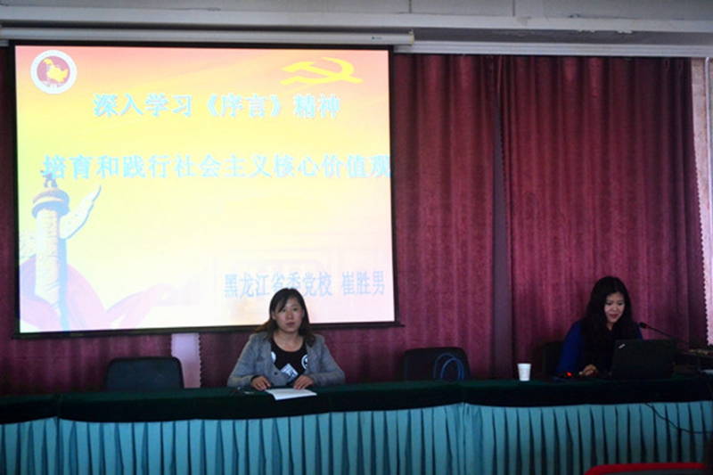 2015年5月13日下午2:00,交通学院501会议室举办了以“学习《序言》精神,培育和践行社会主义核心价值观”为题的主题报告会,此次报告会由黑龙江省委党校崔胜男主讲。交通学院领导班子,党委委员,各教工党支部书记、委员,全院科级干部及部门负责人,学院党校学员参加本次培训,培训由交通学院党委副书记、副院长吴晓红主持。