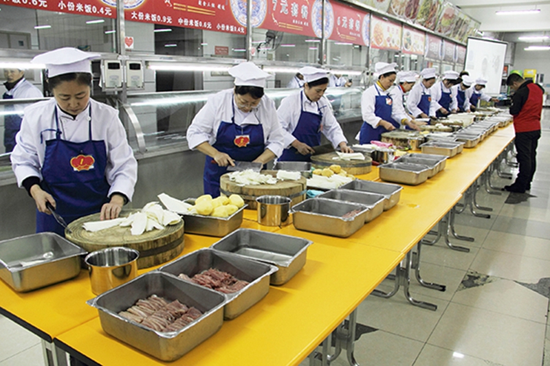 首先,饮食中心主任苗国民宣布比赛正式开始并宣读比赛内容和规则。大赛共分两部分进行,第一部分厨艺比赛包括刀工和烹饪比赛两个环节。刀工比赛要求选手们在规定时间内以直切、推切、拉切、锯切、铡切、滚切等六种刀工方法手工切制土豆丝、生肉丝、肉片和白菜片。第二环节的烹饪比赛要求参赛选手在规定时间内做四道指定菜,分别是锅包肉、鱼香肉丝、素炒土豆丝和醋溜白菜,参赛的副食班组班长各出一道创新菜。所有参赛选手均为饮食中心副食班组和副食加工车间炊事员。