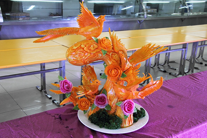 大赛第二部分雕刻展的两名雕刻技师均来自饮食中心教工餐厅,作品名叫“锦上添花”。主要原材料为南瓜。成品由雕刻出的锦鸡、牡丹花树干和绿叶构成。锦鸡活灵活现,红花绿叶相得益彰,技师们对艺术品的精心雕琢赢得了全场来宾和同学们的阵阵掌声,其精湛的技艺绝对可以与星级酒店雕刻师相媲美,吸引着来宾们的眼球。在主食成果展示环节,我们展出了花样饺子、各色糕点、蒸饼、麻花、白锅盔饼、桃酥麻花等二十余种主食,均由两个主食班组亲自打造。教工餐厅也为大赛添砖加瓦,专门送上了金龙鲜鱿鱼、竹韵、蜀丰肥牛卷和碳烤猪颈肉四道拿手好菜。