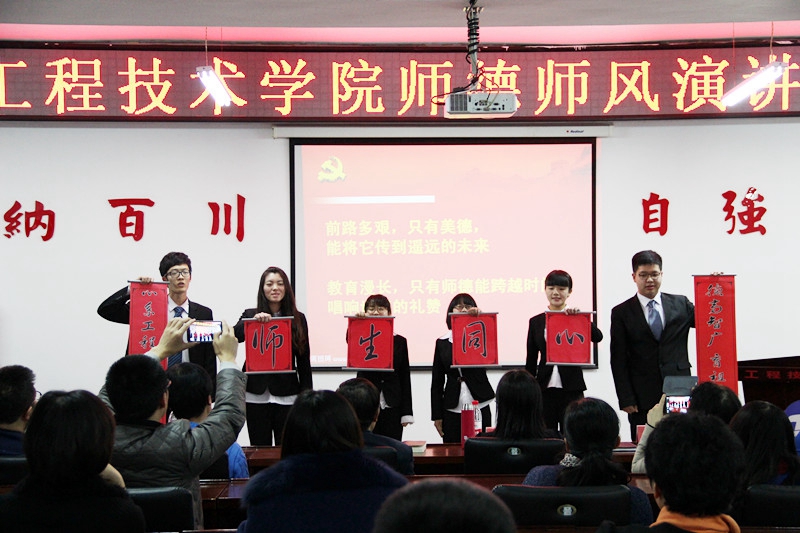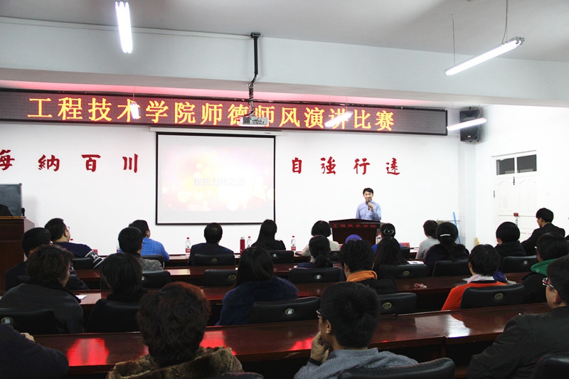 为进一步全面贯彻党的教育方针,扎实推进师德师风建设活动的深入开展,工程技术学院以“师德师风”为主题的教师演讲比赛于11月26日下午14点在工程楼915举行。本次师德师风教师演讲比赛是我院党支部主题活动的系列活动之一,学院全体教师和部分学生党员观看了演讲比赛。
