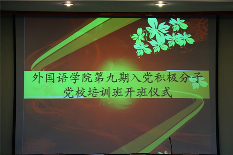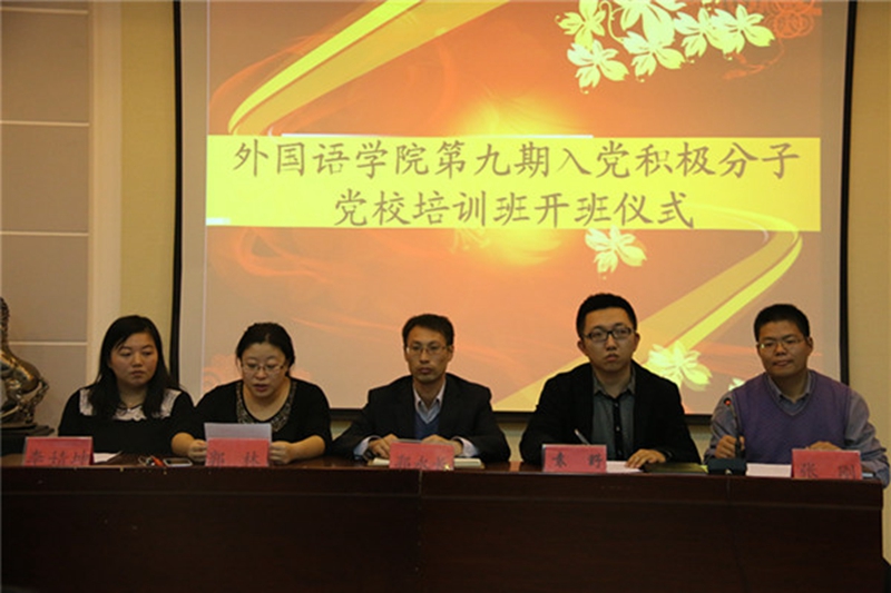 2014年11月7日晚6时,外国语学院第九期入党积极分子培训班开班仪式在文博楼1019室拉开了帷幕。外国语学院党委副书记、副院长郭永长老师,团委书记、2011级政治辅导员郭林老师,学生会秘书长、2014级政治辅导员张刚老师,2012级政治辅导员李婧坤老师以及2013级政治辅导员袁野老师出席了本次开班仪式。张刚老师担任本期培训班班主任并主持了此次开班仪式。来自外国语学院各年级的46名学员参加了本期党校培训班学习。