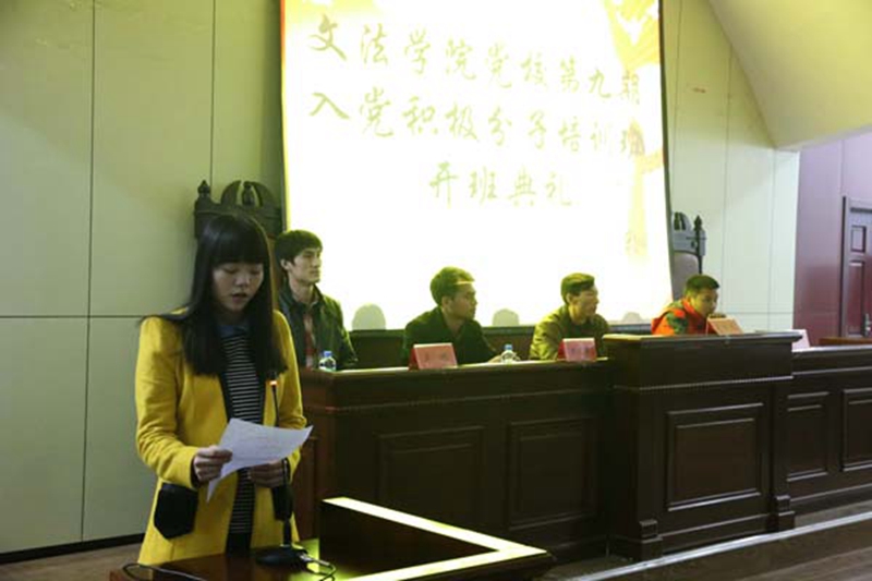 10月29日18时,文法学院党校第九期入党积极分子培训班开班典礼在模拟法庭隆重举行。莅临本次党校开班典礼的有学院党委书记高春光、辅导员刘金升、李顺和王震。开班典礼由李顺主持。
