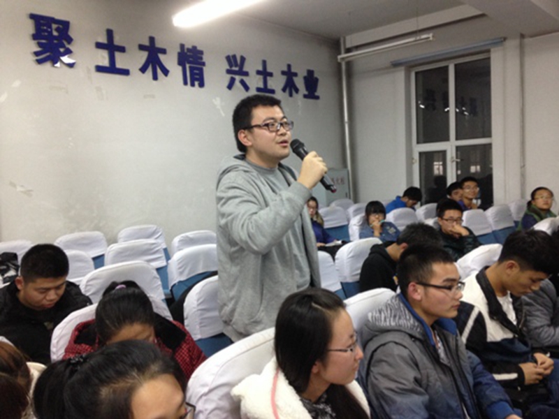 10月21日18时30分,由土木工程学院大学生科技创新中心主办的科技创新活动经验交流会在主东501举办,在交流会上,参加第八届全国大学生结构设计竞赛和第七届全国大学生先进成图技术、产品信息建模创新大赛获奖的同学和大家分享了自己的成功经验和体会,并和现场的同学们展开了互动和交流。土木工程学院党委副书记、副院长王晓光老师、桥梁教研室王立峰副教授、2012级、2013级辅导员白云龙老师也出席了本次交流会。土木工程学院一直高度重视大学生科技创新工作,注重培养大学生科技创新意识和提升实践动手能力。在交流会上,王晓光书记强调了科技创新活动的重要性并鼓励同学们积极参加科技创新活动。王立峰老师为大家介绍了两项竞赛的概况。随后,在第八届全国大学生结构设计竞赛中获得全国三等奖的2012级交通土建二班王文章同学、2012级卓越工程师一班刘鹏同学、2012级卓越工程师二班魏达同学首先作了发言。三位同学借助精心准备的幻灯片,将赛题基本情况、制作模型的技巧、竞赛现场的所见所闻、心得体会以及收获时的喜悦毫无保留地分享给在场的同学,得到了同学们一致认可和好评。接着,在第七届全国大学生先进成图技术、产品信息建模创新大赛获得佳绩的2011级交通土建三班勾志硕同学、2011级城乡规划一班吴雪颖同学、2012级城市规划二班吕美群同学、2011级交通土建四班郭凯强同学也作了发言。四位同学分别从竞赛介绍、软件学习过程、绘图练习阶段、比赛心态等方面做了介绍,使同学们深刻地了解了创新大赛的关键和细节。现场互动中,同学们积极提问、踊跃交流,现场气氛达到高潮。