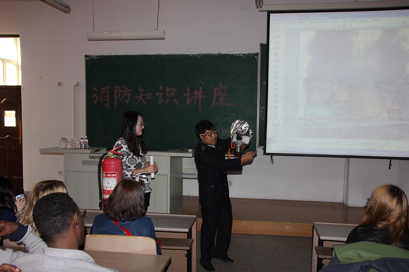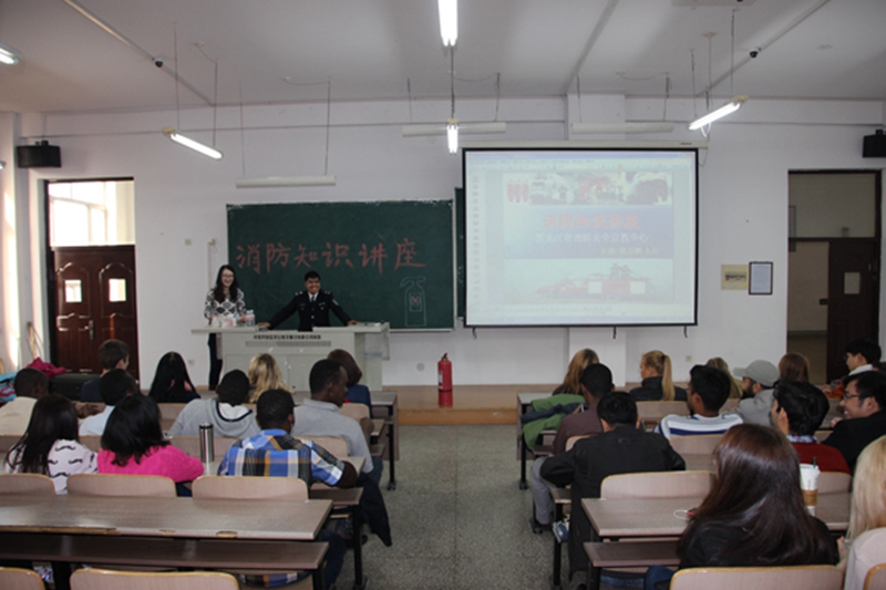 为提高学院教职工、广大留学生的消防安全意识,切实提高正确处理火灾等突发事件的应急能力,在保卫处的积极协助下,国际交流学院于2014年10月15日14:00邀请黑龙江省消防安全宣教中心陈万鹏主任在丹青楼T301教室进行了消防安全知识讲座。讲座由姜淋耀同学进行英语同步翻译。学院教职工、全体留学生及留学生公寓门卫参加了讲座。
