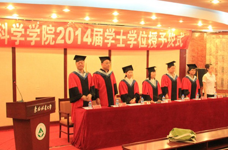 在庄严的国歌声中,学士学位授予仪式拉开了序幕。副院长滕春波宣读了2014届校优秀毕业生名单,与会嘉宾为优秀毕业生颁奖;副院长王晶英宣布了《生命科学学院关于授予2014届毕业生学士学位的决定》;院长李玉花亲自为每一位学士学位获得者拨正流苏、颁发学位证书并合影留念。生物技术一班学生王海飙代表获得学士学位的2014届本科毕业生发言,他用平实的语言带全体毕业生一同回顾了美好的大学生活,得到了大家的深切共鸣;他代表毕业生表达了对学校、学院及全体老师的感恩之情,并表示毕业生们决不会辜负师长的殷切期望,一定肩负起学校和社会的责任,牢记“学参天地,德合自然”的校训,为开创更加美好的明天而努力奋斗。