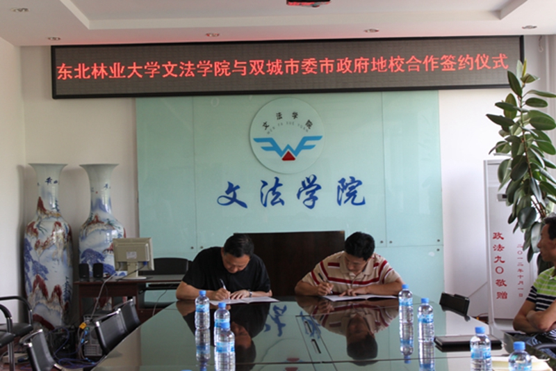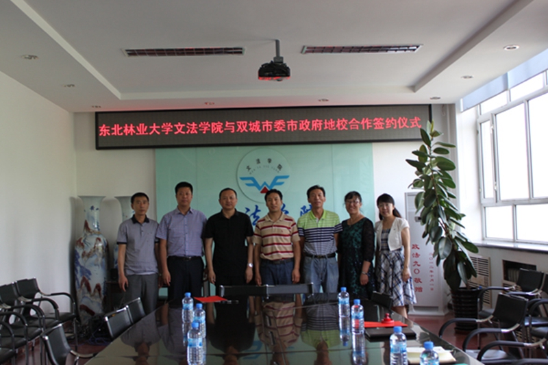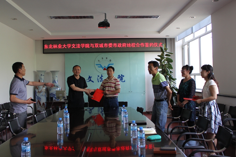 6月19日上午,东北林业大学文法学院与双城市委市政府在文法学院会议室举行了“深入开展法律宣传和法律咨询合作”签约仪式。双城市委副书记、政法委书记郭玉志,双城市委政法委常务副书记岳斌,双城市法学会秘书长徐兴军,我校文法学院院长李景义、党委书记高春光、法学专业负责人包玉华等出席了签约仪式。