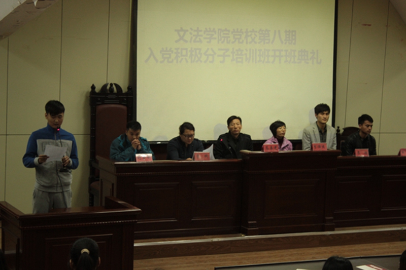 2014年4月9日18时,文法学院党校第八期入党积极分子培训班开班典礼在模拟法庭隆重举行。出席本次党校开班典礼的有学院党委书记高春光,学院党委副书记、副院长李伟杰,团委书记李鹏,辅导员刘金升、李顺和王震老师。开班典礼由刘金升主持。