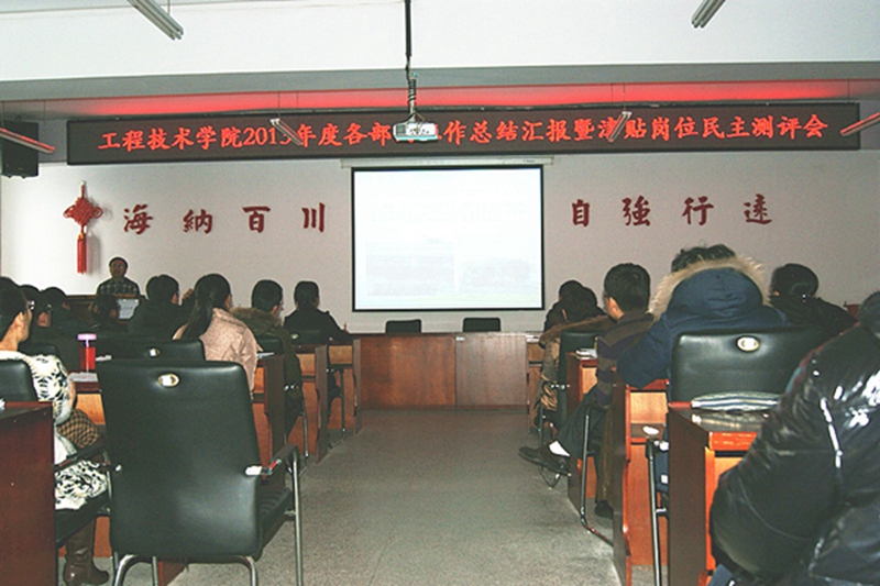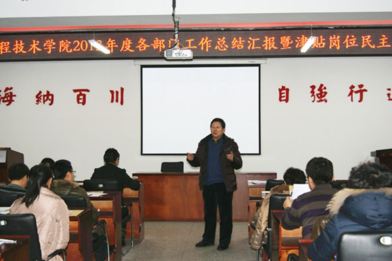 工程技术学院于12月19日在工程楼915室召开2013年度部门工作总结汇报暨津贴岗位民主测评会,会议由工程技术学院院长董喜斌同志主持,工程技术学院全体教职工参加。
