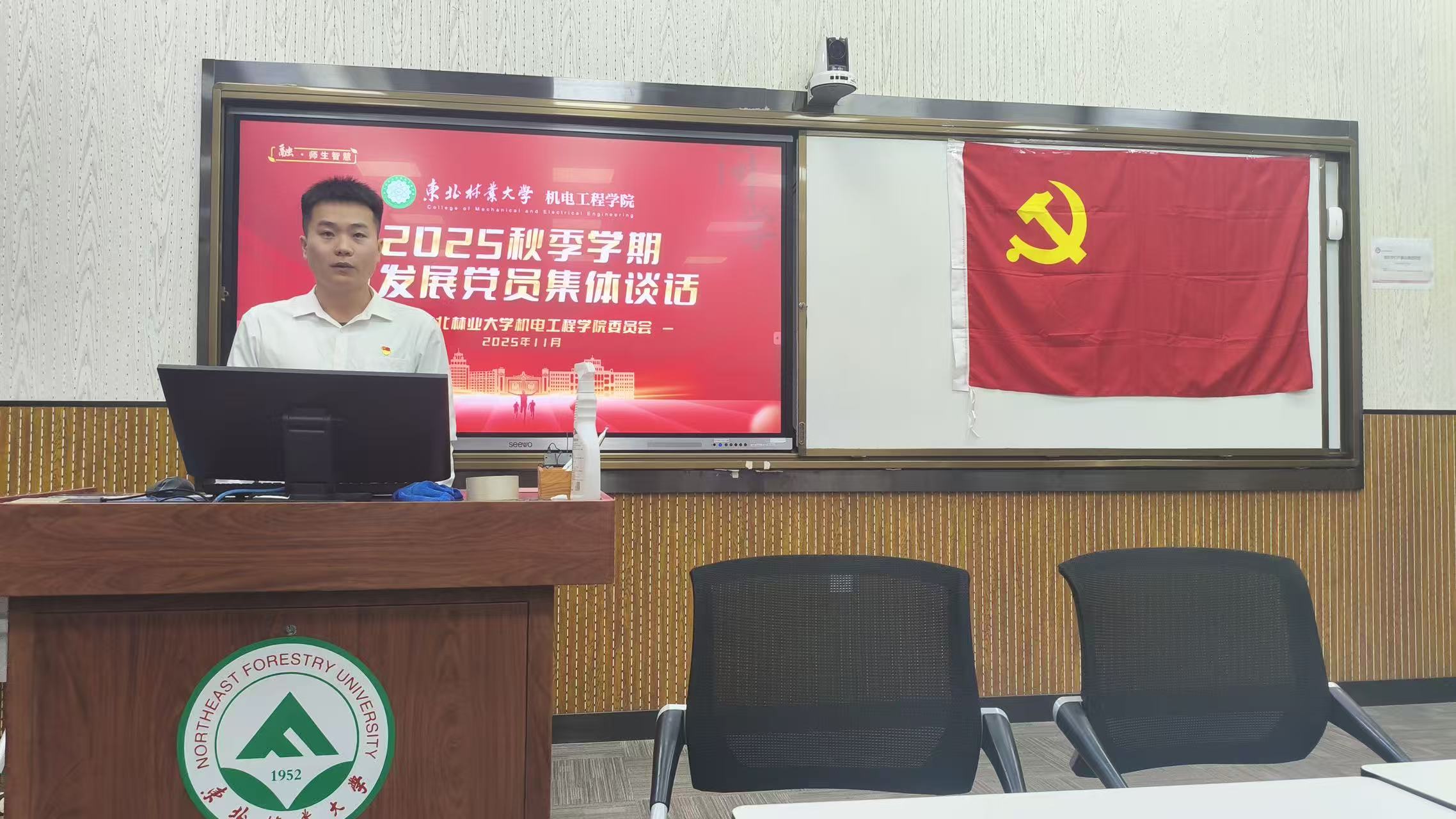 为深入学习贯彻习近平新时代中国特色社会主义思想和党的二十届四中全会精神,进一步检验学习成效,加强党员党性锻炼,为党组织选拔和培养高素质后备力量,11月22日机电工程学院党委组织本学期拟发展的研究生党员,在奥林楼408室举行了集体谈话暨“同心向党,启航新征程”主题党日活动。学院党委委员、研究生辅导员吴晓红,研究生辅导员郑凯航,各研究生党支部书记参加活动。活动由博士研究生党支部书记贾明旭主持。